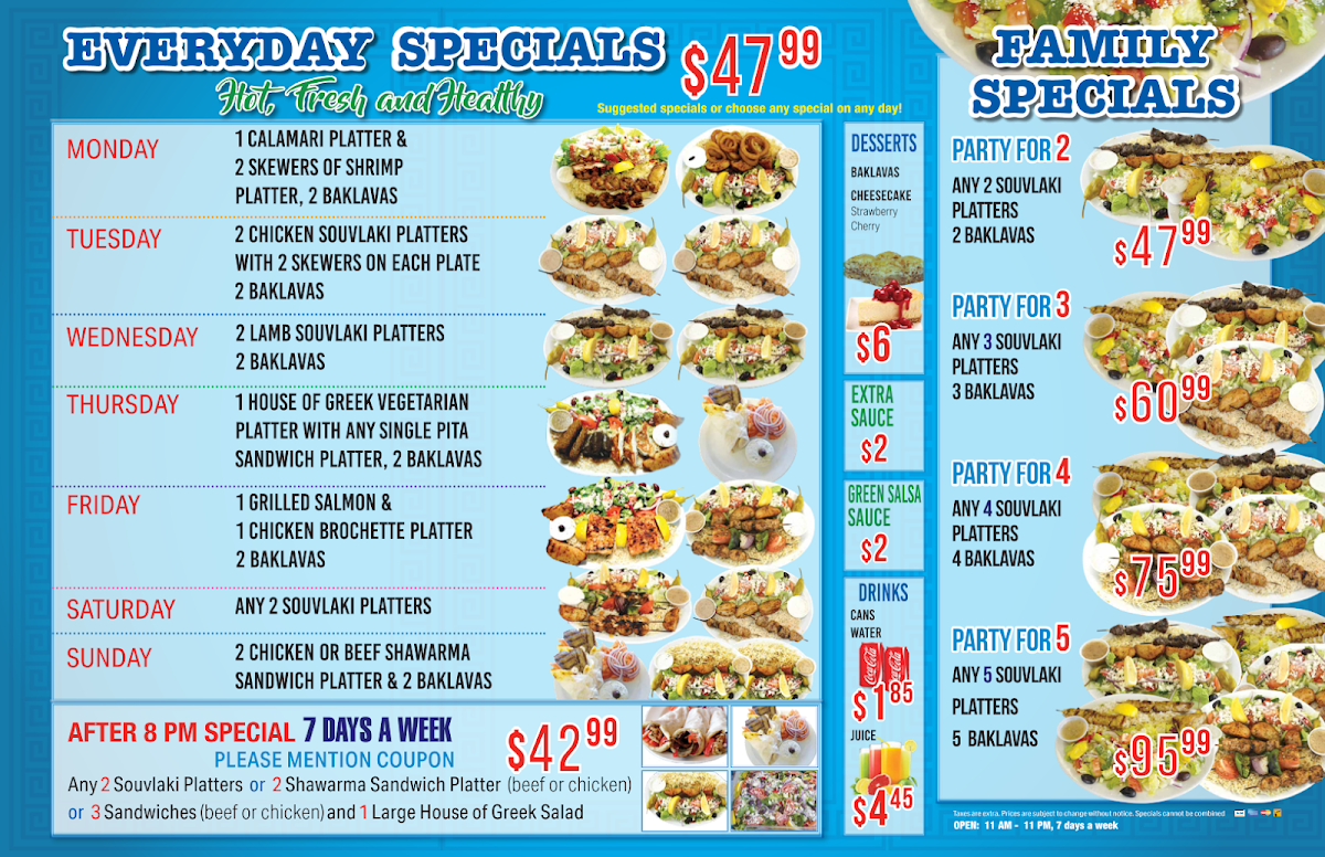 ALL PLATTERS ARE SERVED WITH GREEKS SALAD, GREEK POTATOES, TZATZIKI SAUCE, LEMON & RICE PILAF